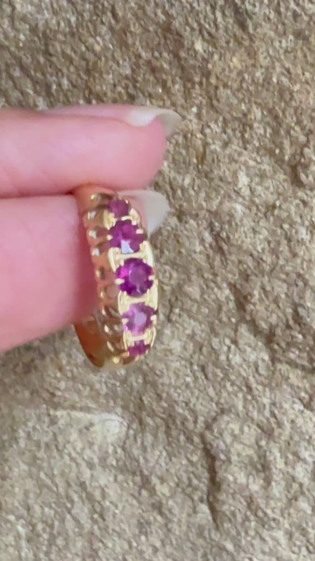A Rare to find Antique five stone ring set throughout with pink Tourmalines! The deep pink Tourmalines spread across the front of the finger to stunning effect, claw set in a boat style setting